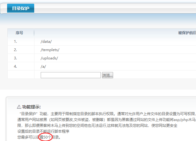 为防止木马被上传执行, 也可使用主机控制面板中的“目录保护”功能,依次选择templates、uploads、data等目录添加保护(以禁止脚本执行,防止黑客上传木马)