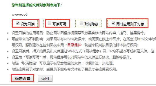 主机控制面板中点击 “文件管理” 选中wwwroot目录 在点击 “权限” 按钮,将整站所有文件设置为只读即可。